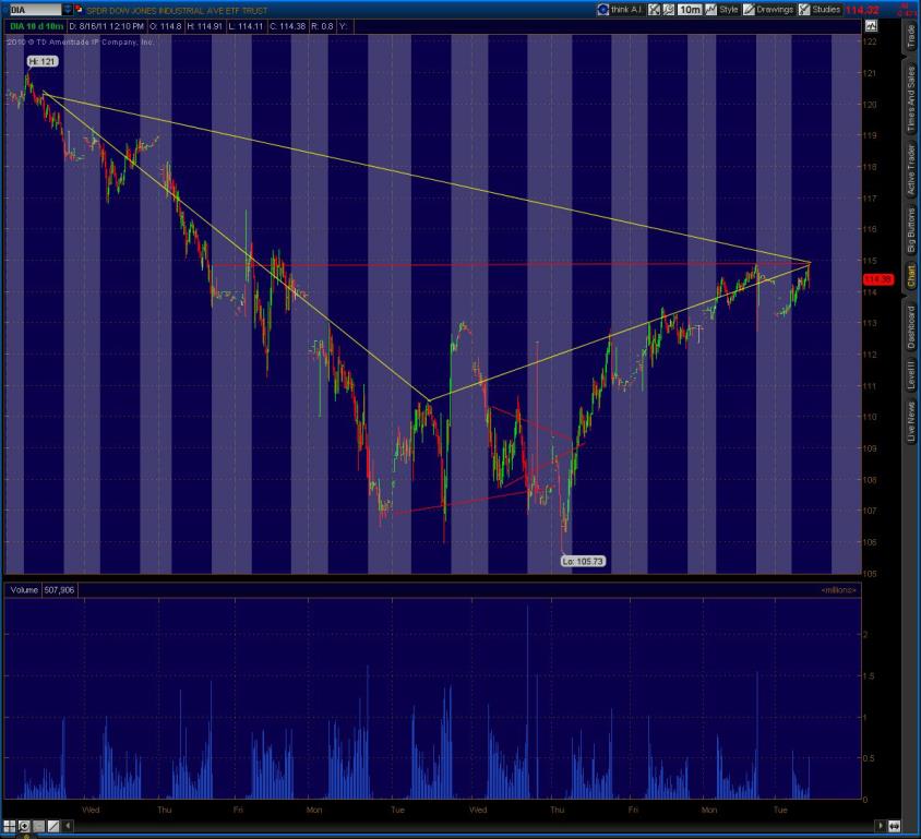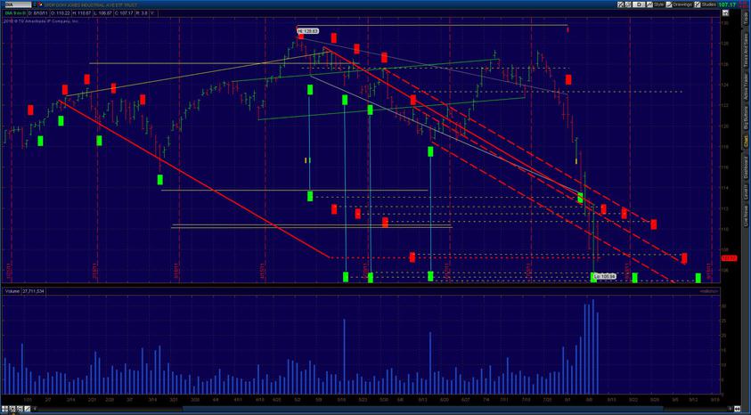 At 12:29PM EST MDPP issued a DEV MDPP PRECISION PIVOT ALERT indicating a significant potential trend reversal challenge to the recovery uptrend from the earlier AUGUST lows is now in EFFECT. LONG Position covering at 114.25 to 115 on the DIA equivalency basis from the 106 lows earlier in August is now SUGGESTED. This pivot was also preceeded today by the obtainment of a KEY MDPP QEV price level INTERSECT and fullfilment.